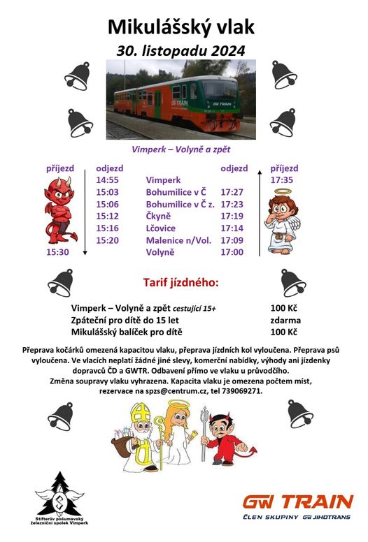 Stifterův pošumavský železniční spolek vás zvou do Mikulášského vlaku, který vyráží z Vimperského vlakového nádraží do Volyně a zpět.