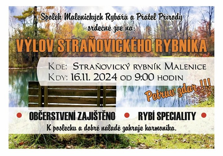 Výlov Straňoviského rybníka Místo konání: Malenice 16. 11. 2024, 0900 — 0000 Spolek Malenických rybářů vás zvou na tradiční výlov rybníku s prodejem rybích specialit.