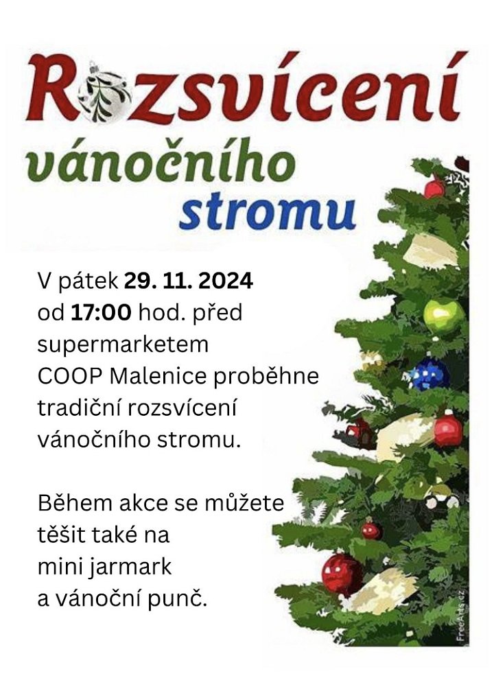 Rozsvícení vánočního stromu v Malenicích Místo konání: Malenice 29. 11. 2024, 1700 — 0000 Zveme vás na tradiční rozsvěcení vánočního stromu.