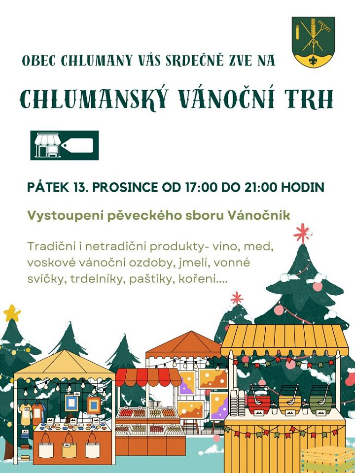 Vánoční Chlumanský trh Místo konání: Chlumany 13. 12. 2024, 1700 — 2100 Srdečně zveme na náš tradiční vánoční trh.