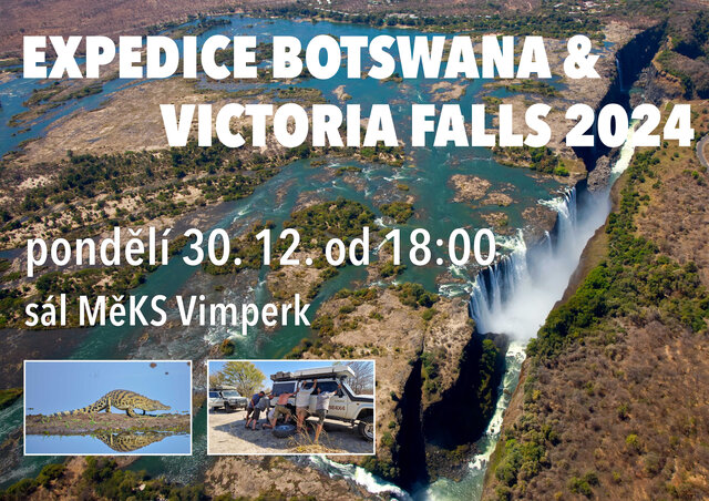 Přednáška: Expedice Botswana & Victoria Falls 2024 Místo konání: Vimperk 30. 12. 2024, 1800 — 0000 Cestopisné povídání nejen o potápění. Vstupné: dobrovolné