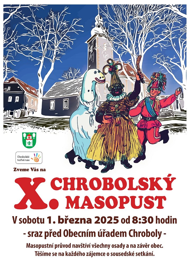 X. Chrobolský MASOPUST Místo konání: Chroboly 1. 3., 0830 — 0000 Masopustní průvod vyrazí od OÚ v Chrobolech.