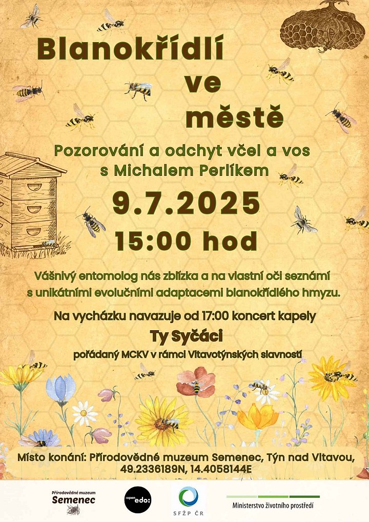 Součástí komentované entomologické procházky bude také pozorování včel a vos v přírodě, jejich odchyt a demonstrace z blízka a na vlastní oči, a popis jejich unikátních evolučních adaptací. Procházku povede a o hmyzu bude vykládat Michal Perlík.