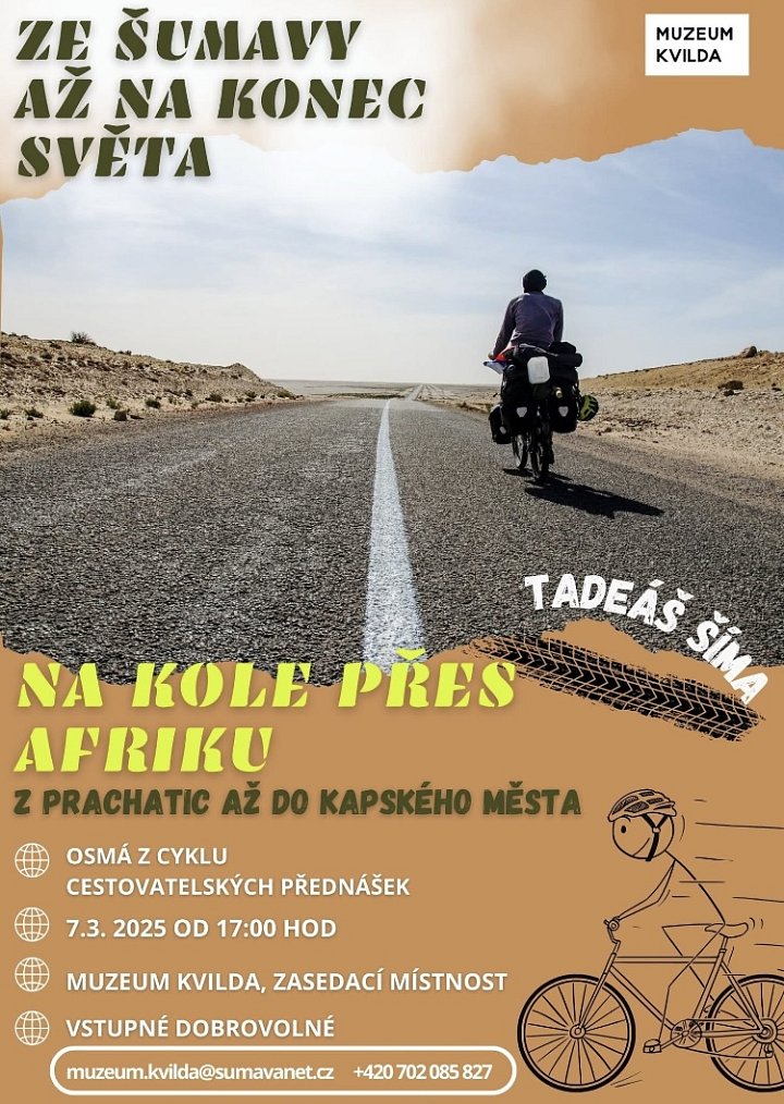 Ze Šumavy až na konec světa: Na kole přes Afriku Místo konání: Kvilda 7. 3., 1700 — 0000 Zveme vás na přednášku a neuvěřitelné příhody Tadeáše Šímy. Vstupné: dobrovolné