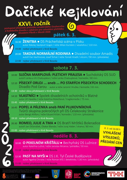 Dačické kejklování Místo konání: Dačice 6. 3., 1630 — 8. 3., 1800 Krajská postupová přehlídka amatérských divadel Milovníci ochotnického divadla, těšte se! O víkendu 6.-8.3.2026 Dačice ožijí divadelní atmosférou – přivítáme skvělé divadelní soubory z různých koutů.