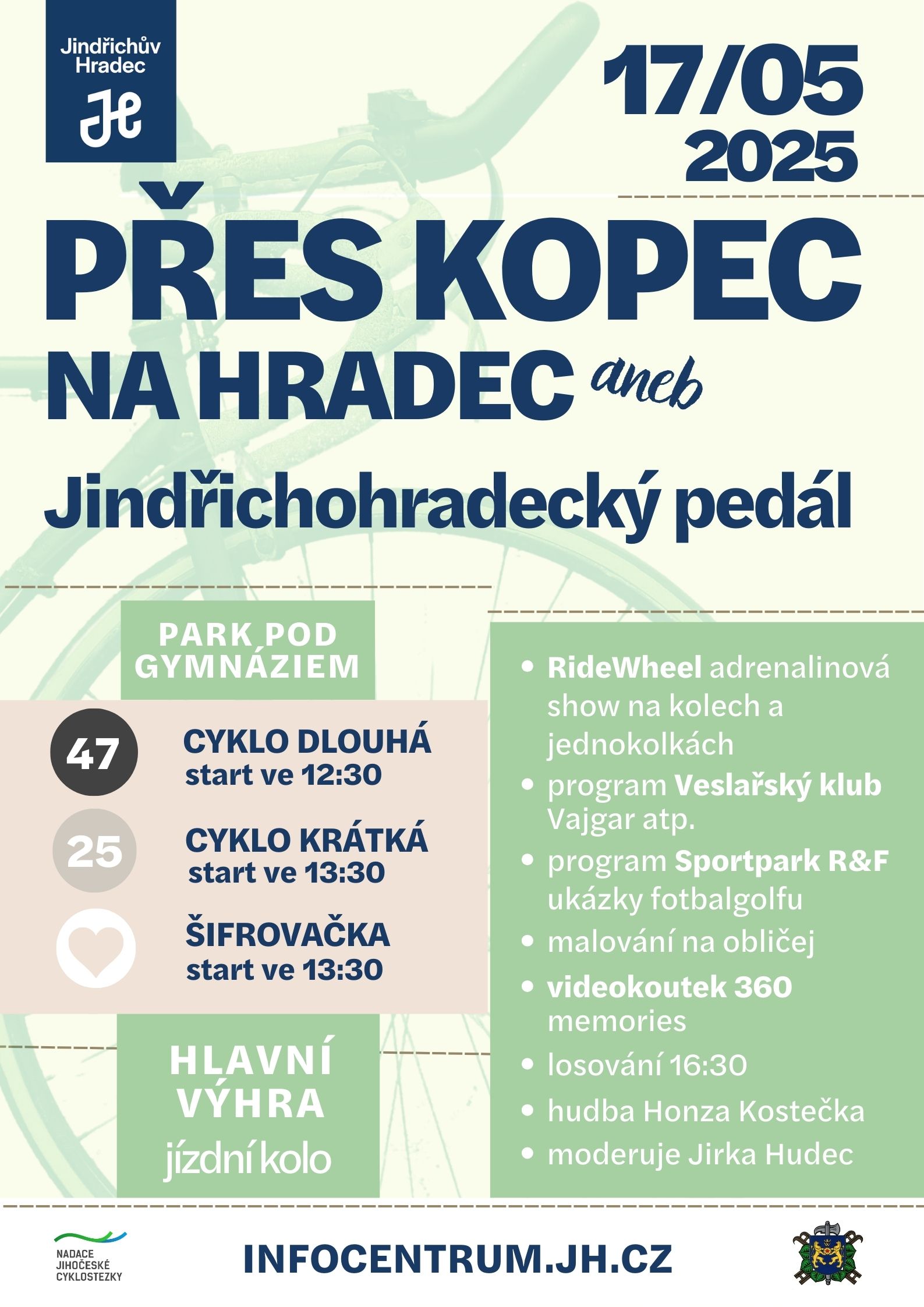 Celý den se ponese ve sportovním duchu v rámci projektu „Jindřichův Hradec – Evropské město sportu 2025“. Těšit se můžete na vystoupení skupiny RideWheel s adrenalinovou show na kolech a jednokolkách a na bohatý doprovodný program připravený místními sportovními organizacemi. Jednou z nich bude místní Veslařský klub Vajgar a v rámci programu se také představí otínský Sportpark R&F s ukázkami fotbalgolfu, který si budete moci i sami vyzkoušet. Na menší děti bude čekat oblíbené malování na obličej a všichni si mohou odnést originální památku z videokoutku 360 memories, který přináší dynamické 360 video záběry a dokonale tak vystihne atmosféru z celé akce. Ten poskytne jindřichohradecká mediální agentura Media crew.