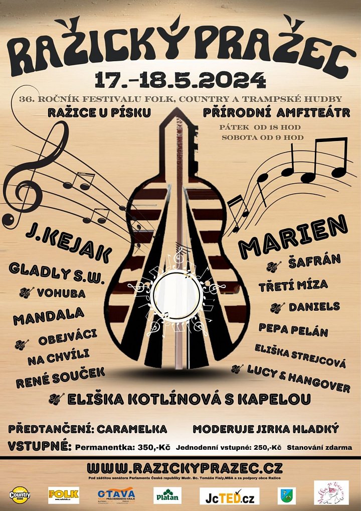 Ražický pražec Místo konání: Ražice 15. 5., 1800 — 17. 5., 0900 36. ročník tradičního folk, country, trampského festivalu.