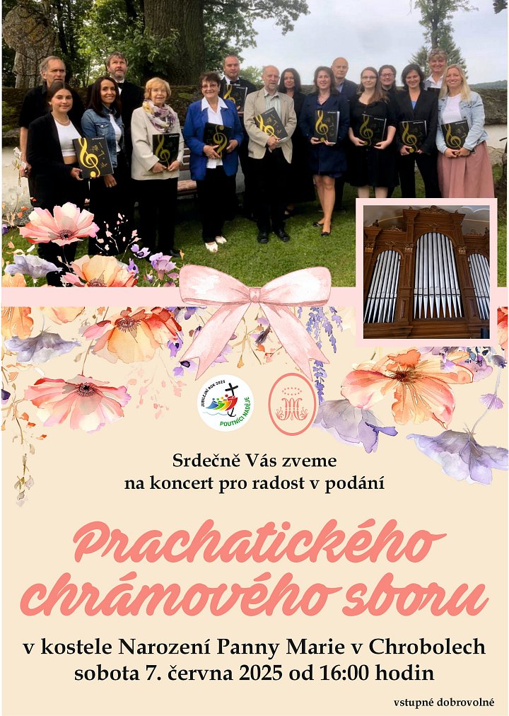 Koncert: Prachatický chrámový sbor Místo konání: Chroboly 7. 6., 1600 — 0000 Zveme vás na koncert pro radost.