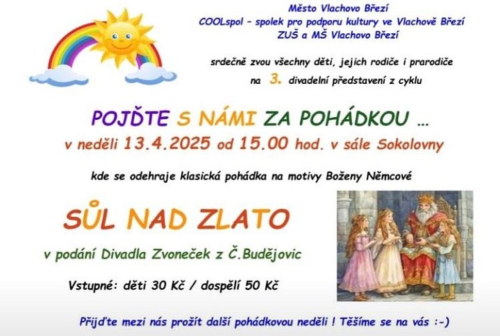 Pojďte s námi za pohádkou: Sůl na zlato Místo konání: Vlachovo Březí 13. 4. Zveme vás na 3. divadelní představení v podání Divadélka Zvoneček z Českých Budějovic. Vstupné: 30,- Kč/ děti; 50,- Kč/ dospělí