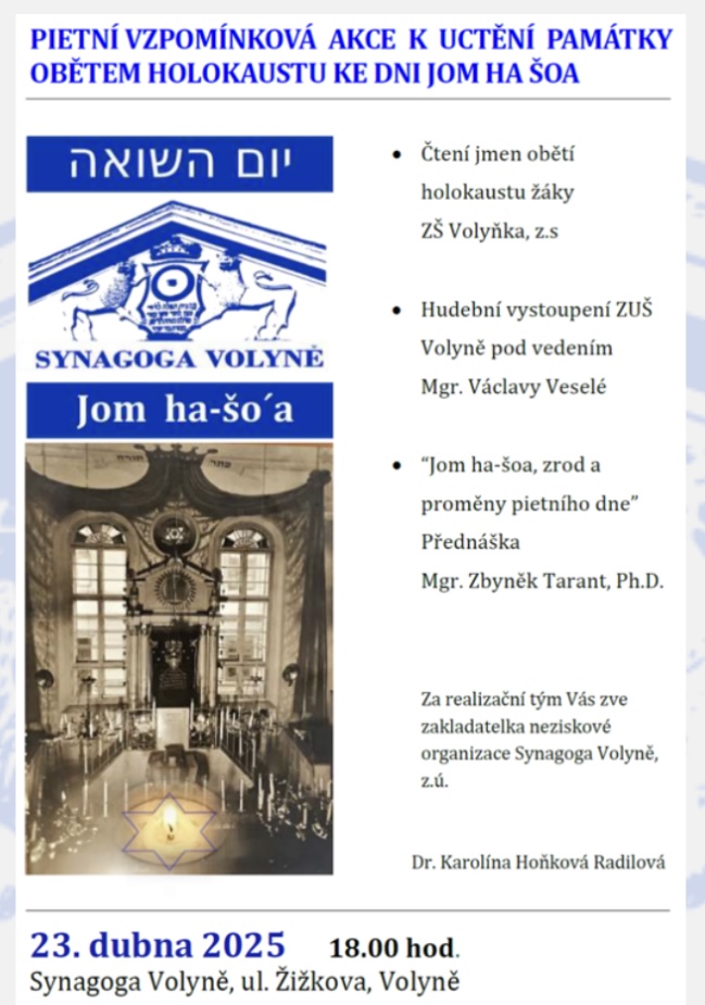 Pietní vzpomínková akce ke dni JOM HA ŠOA Místo konání: Volyně 23. 4., 1800 — 0000 Pietní vzpomínková akce k uctění památky obětem holokaustu ke dni Jom ha-šoa.