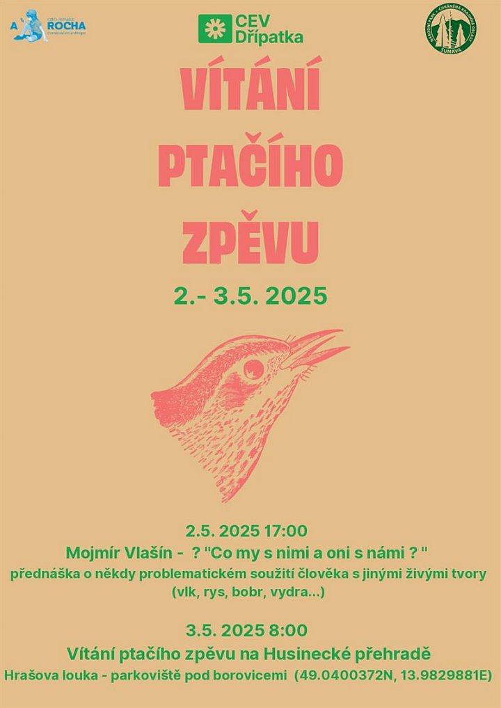 Výlet: Vítání ptačího zpěvu na Husinecké přehradě Místo konání: Husinec 3. 5., 0800 — 0000 Tradiční vycházka z Hrašovy louky. Vstupné: zdarma