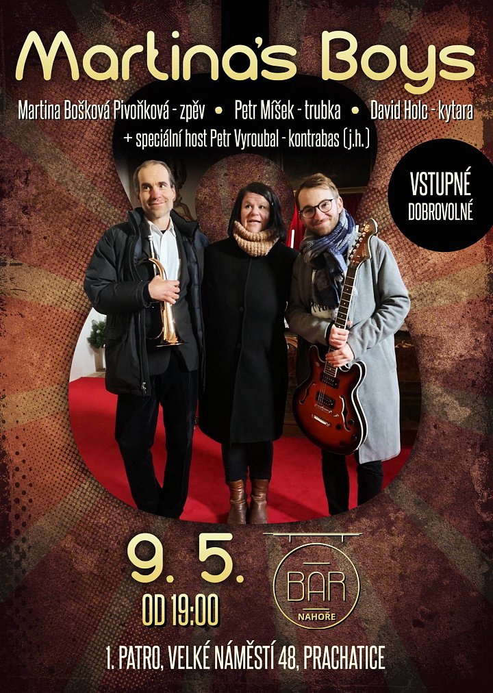 Koncert: Martina´s Boys Místo konání: Prachatice 9. 5., 1900 — 0000 Martina Bošková Pivoňková & Petr Míšek & David Holc & speciální host Petr Vyroubal Vstupné: dobrovolné