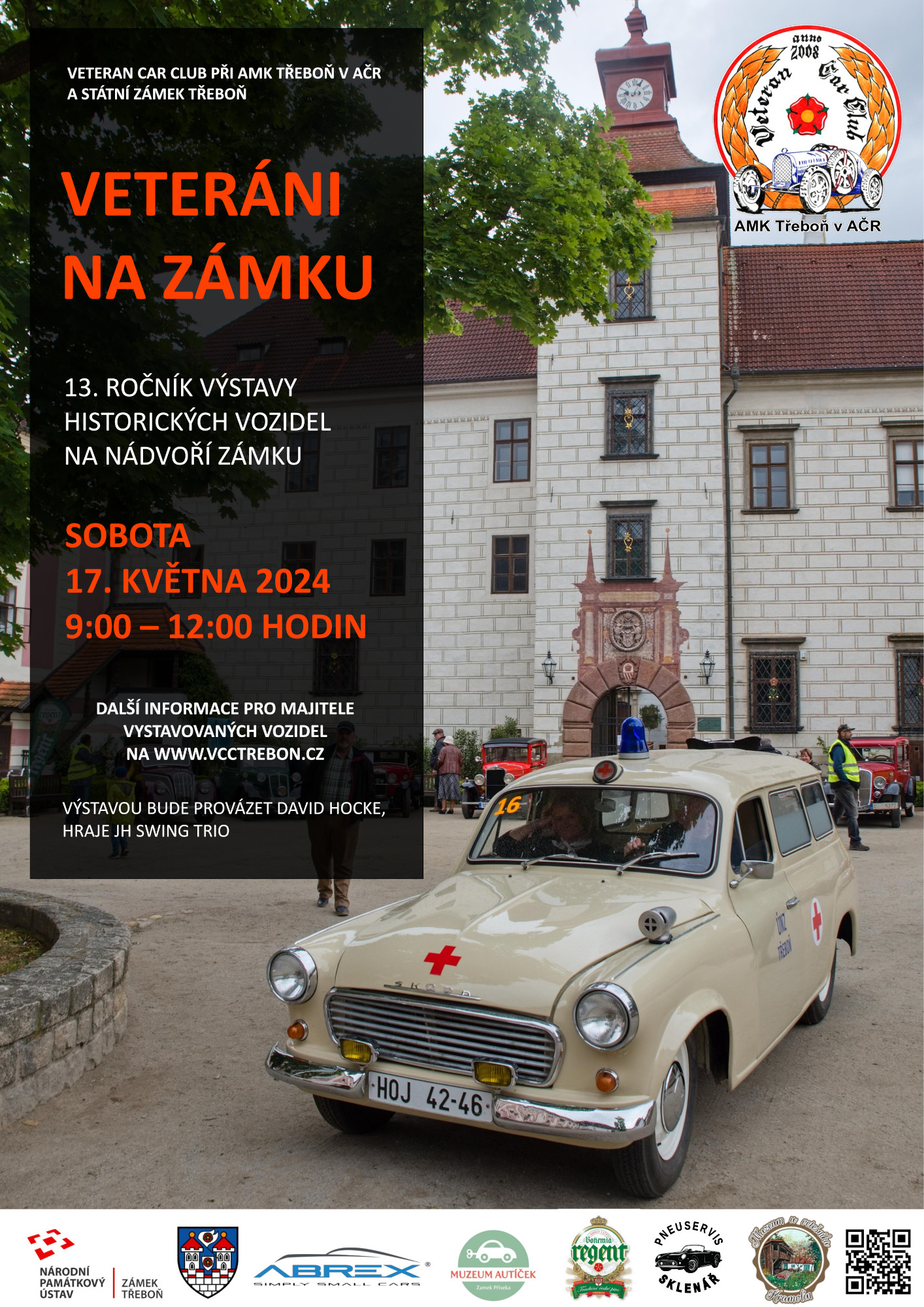 Veteráni na zámku 2025 Místo konání: Třeboň 17. 5., 0900 — 1200 Veteran car club při AMK Třeboň v AČR pořádá v sobotu 17. května 2025 na nádvoří zámku v Třeboni výstavu historických vozidel.Výstava probíhá od 9:00 do 12:00.