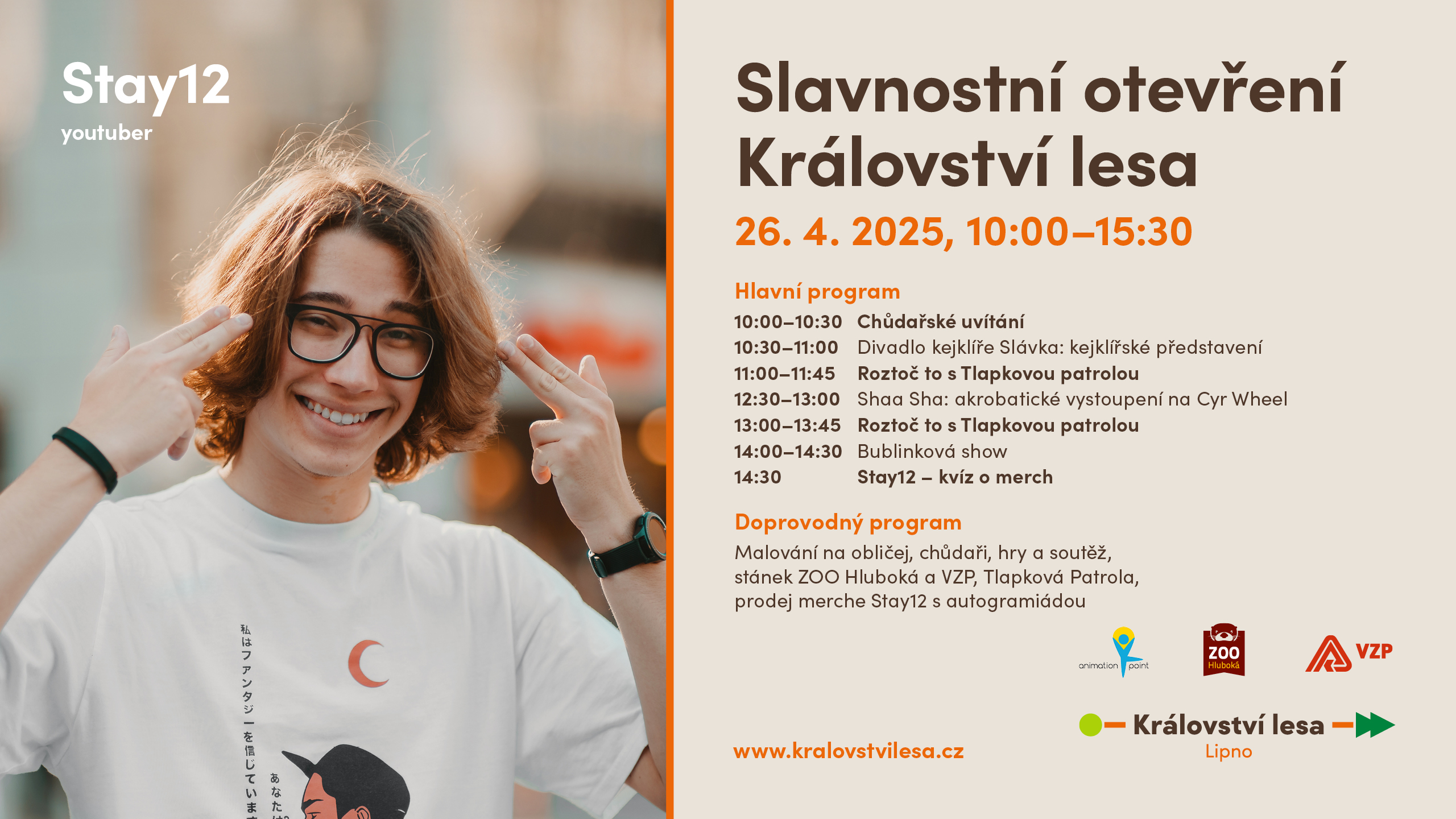 Sezóna v Království lesa začíná ve velkém stylu! Přijďte si s celou rodinou užít den plný zážitků, smíchu a fantazie. Čeká vás bohatý program s kouzelnou atmosférou lesa – kejklíři, bubliny, akrobaté, Tlapková patrola a oblíbený youtuber Stay12.