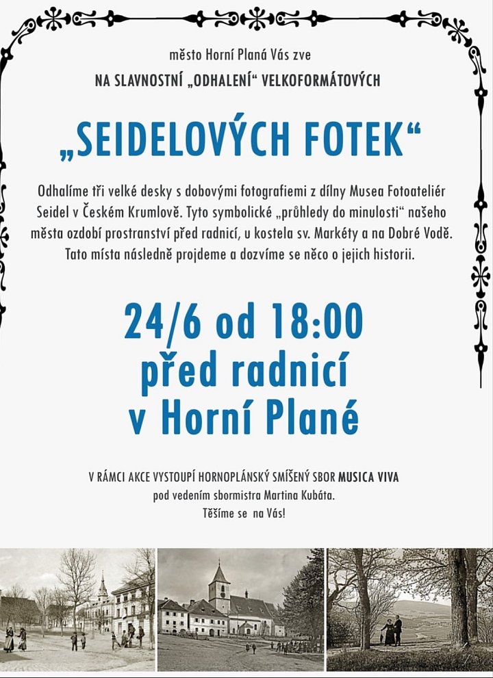 Zveme Vás k odhalení tří unikátních velkoformátových desek s dobovými fotografiemi z proslulé dílny Musea Fotoateliér Seidel v Českém Krumlově. Tyto nádherné a symbolické „průhledy do minulosti“ Horní Plané budou umístěny na třech významných místech našeho města: