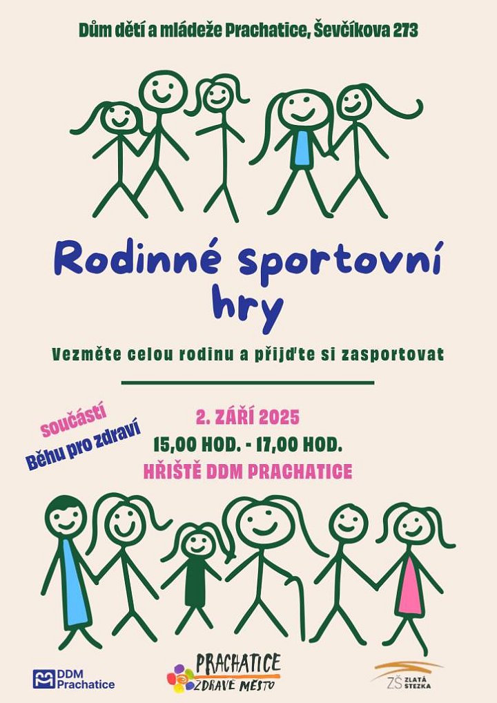 Rodinné sportovní hry 2025 Místo konání: Prachatice 2. 9., 1500 — 1700 Sportovní odpoledne pro celou rodinu. Součástí akce je celodenní "Běh pro zdraví".
