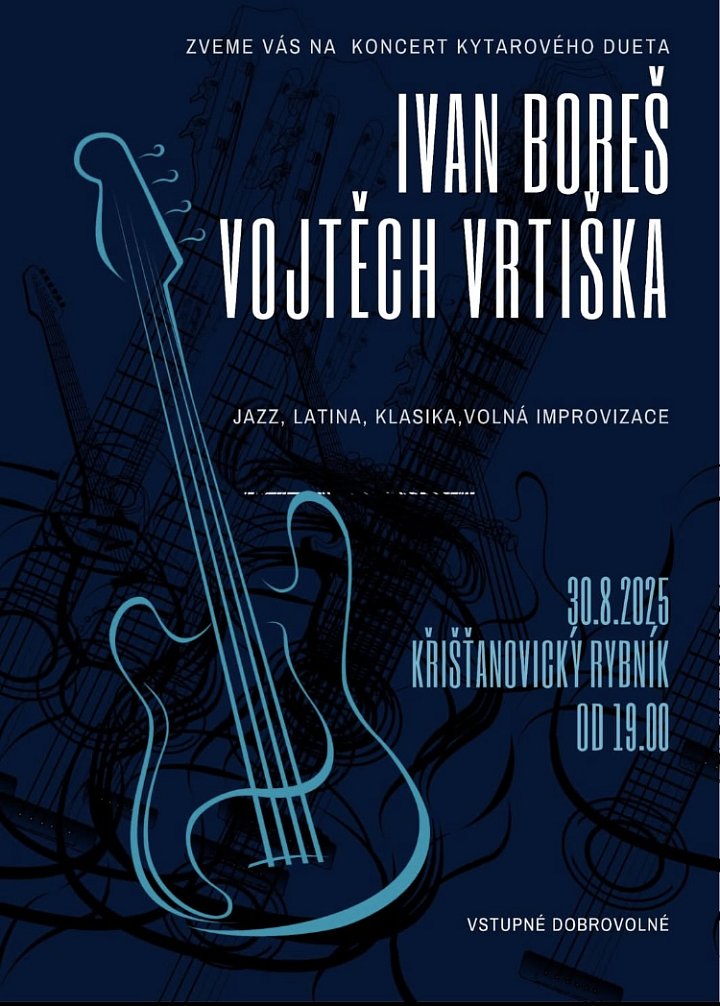Koncert: Ivan Boreš & Vojtěch Vrtiška Místo konání: Křišťanovice 30. 8., 1900 Klasická kytara, jazz, latina, volná improvizace...