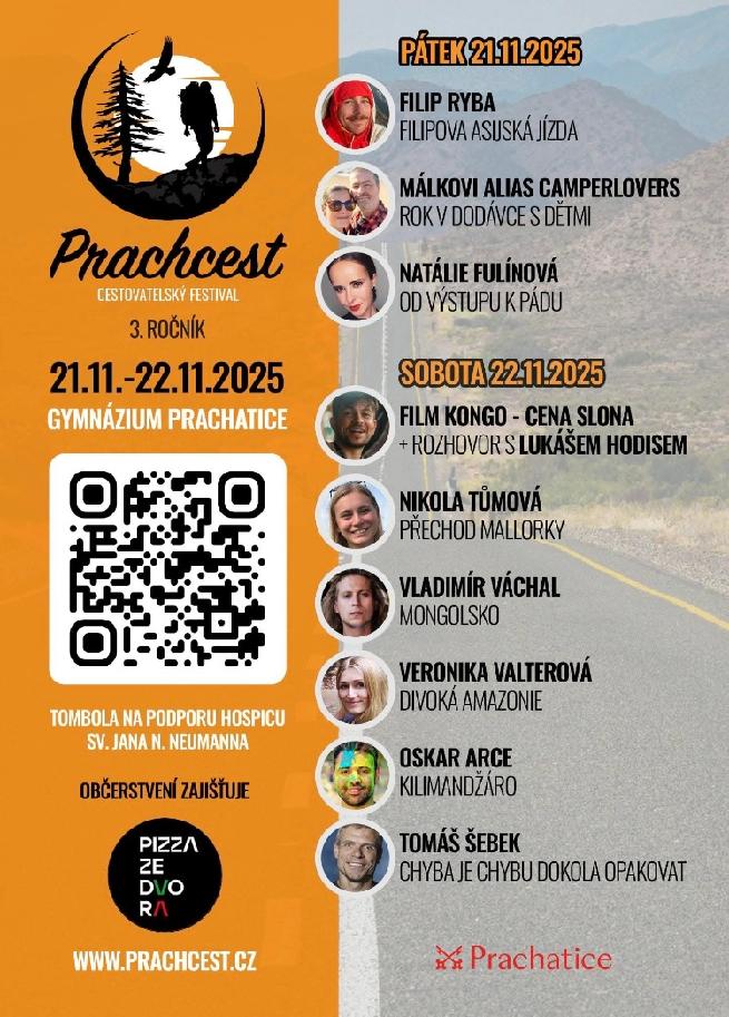 Prachcest vznikl za účelem vzájemné inspirace dobrodruhů s přesahem na ochranu přírody. V krásném prostředí Prachatického gymnázia na vás čeká dvoudenní porce přednášek ze všech koutů světa. Můžete se těšit na dobrodružná povídání těch nejlepších horolezců, ochránců přírody, sportovců a fotografů, kteří se sejdou pod jednou střechou, aby se s námi podělili o své zkušenosti. Během festivalu nebude nouze o doprovodné programy a občerstvení v útrobách budovy. Prachcest se nese v duchu podpory charitativních projektů, a proto bude celý výdělek bohaté tomboly věnován Prachatickému hospicu.