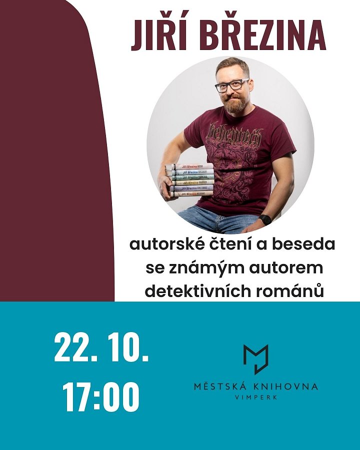Beseda: Jiří Březina Místo konání: Vimperk 22. 10., 1700 Autorské čtení a beseda se známým autorem detektivních románů Jiřím Březinou.