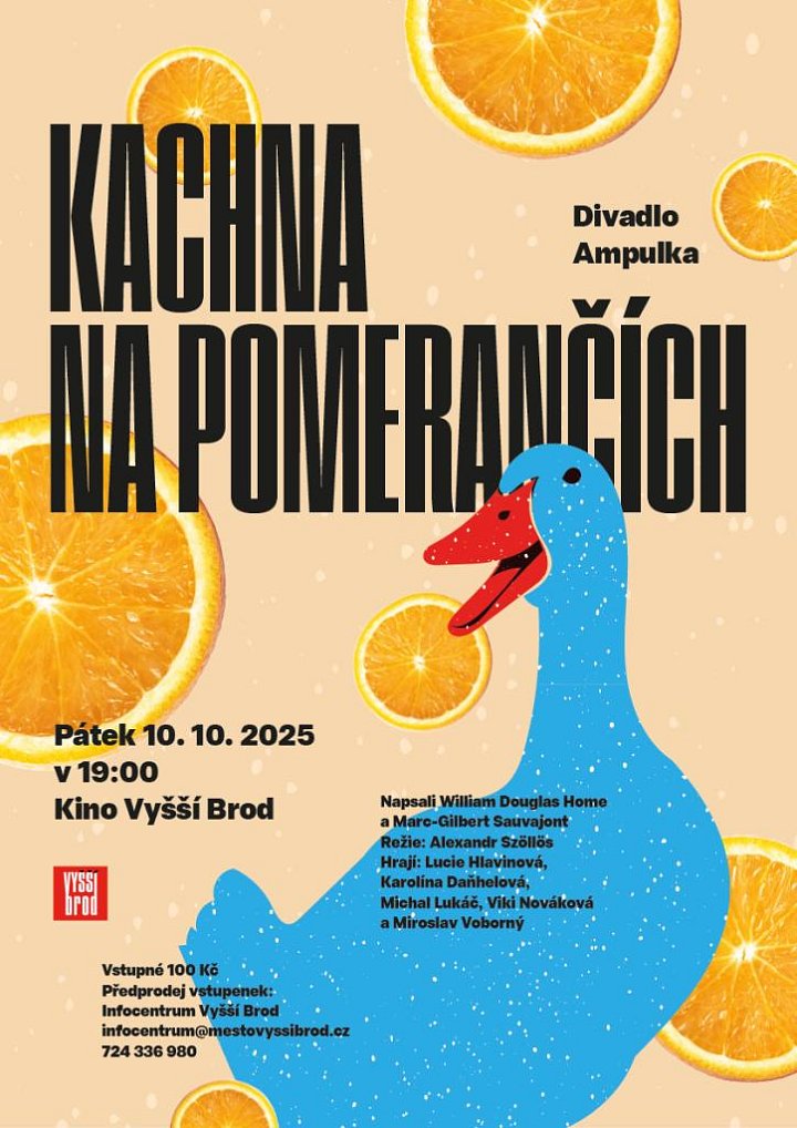 Kachna na pomerančích – brilantní francouzská komedie plná záměn, žárlivosti a typického francouzského šarmu. Divadlo Ampulka přiveze do Vyššího Brodu svižnou hru, která slibuje večer plný humoru, napětí a nečekaných situací.