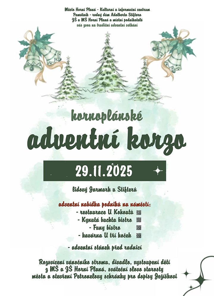 Zveme Vás na tradiční před vánoční setkání – hornoplánské adventní korzo, které neodmyslitelně patří k tomuto dni, kdy na závěr rozsvítíme vánoční strom. Čekat Vás budou dobroty, výrobky i dílničky v místních podnicích. Těšíme se na Vás!