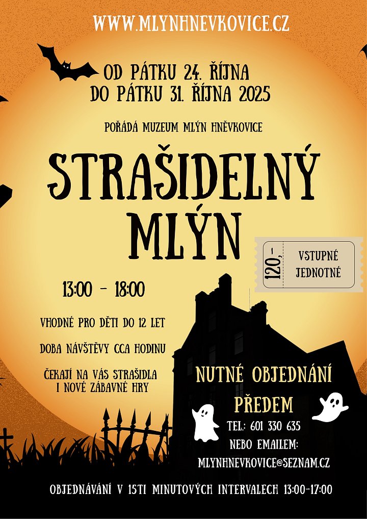Od pátku 24. října do pátku 31. října 2025 mezi 13. a 18. hodinou se Muzeum mlýn Hněvkovice promění jako každý rok ve Strašidelný mlýn plný zážitků! Čekají na vás strašidla, nová zábavná stanoviště i hledací hra. Program je připravený především pro děti do 12 let, ale určitě se budou bavit i dospělí.