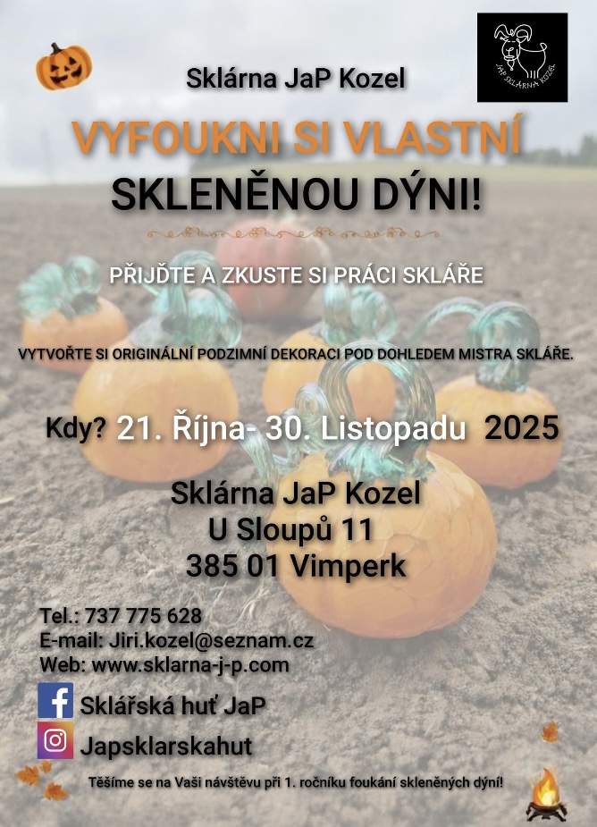 1. ročník foukání skleněných dýní Místo konání: Vimperk 21. 10. — 30. 11. Srdečně Vás všechny zveme na 1. ročník foukání skleněných dýní!