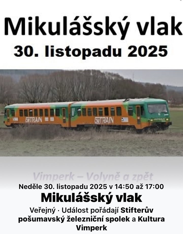 Jízda zvláštního vlaku v trati Vimperk - Volyně a zpět s Mikulášem, andělem a čerty.