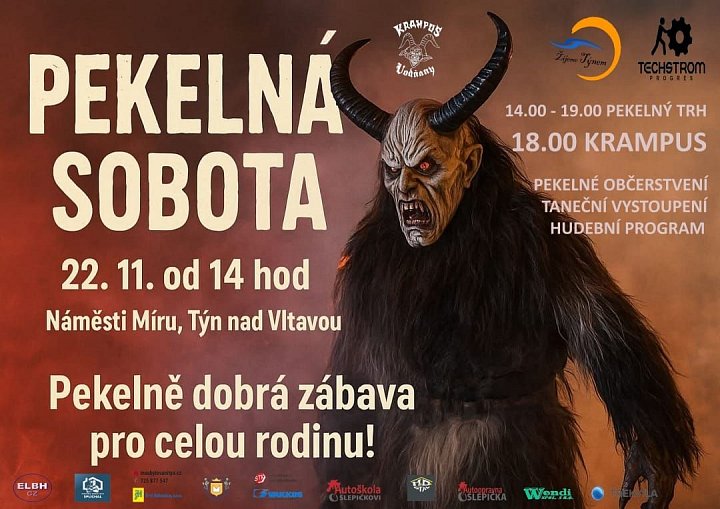 V sobotu 22. listopadu od 14 hodin ožije Náměstí Míru v Týně nad Vltavou čertovským veselím, vůněmi a zábavou pro všechny generace. Od 14:00 do 19:00 se uskuteční Pekelný trh plný dobrot, rukodělných výrobků a vánoční atmosféry. Hlavním bodem programu bude v 18:00 Krampus show, při které se návštěvníci setkají s pekelnými bytostmi a zažijí jedinečnou podívanou plnou adrenalinu. Akce nabídne zábavu pro celou rodinu a slibuje nezapomenutelnou sobotu v centru města.