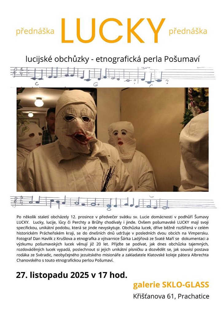 Po několik staletí obcházely 12. prosince v předvečer svátku sv. Lucie domácnosti v podhůří Šumavy LUCKY. Lucky, lucije, lůcy či Perchty a Brůhy chodívaly i jinde. Ovšem pošumavské LUCKY mají svoji specifickou, unikátní podobu, která se jinde nevyskytuje. Obchůzka lucek, dříve běžně rozšířená v celém historickém Prácheňském kraji, se do dnešních dnů udržuje v posledních dvou obcích na Vimpersku. Fotograf Dan Havlík z Krušlova a etnografka a výtvarnice Šárka Ladýřová ze Svaté Maří se dokumentaci a výzkumu pošumavských lucek věnují již 20 let. Přijďte se podívat, jak dnes obchůzka tajemných, rozdováděných lucek vypadá, poslechnout si jejich unikátní písničku a dozvědět se, jak souvisí postava rodáka ze Svéradic, neobyčejného jezuitského misionáře a zakladatele Klatovské koleje Albrechta Chanovského s touto etnografickou perlou Pošumaví.