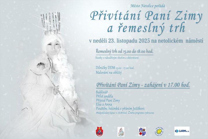 - bohatý kulturní program: trhy 15 - 18 hodin trh, zahájení akce Přivítání Paní Zimy 17 hodin.