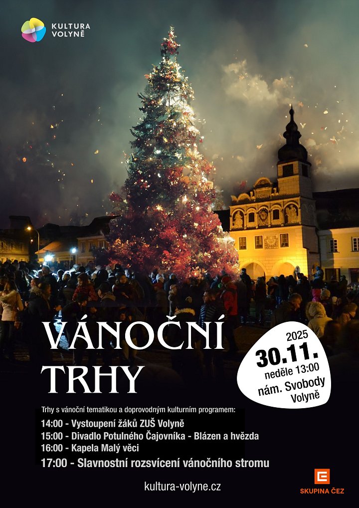 Těšit se můžete na vystoupení ZUŠ Volyně, divadlo Blázen a hvězda od Potulného Čajovníka, kapelu Malý Věci. Trhy zakončíme slavnostním rozsvícením vánočního stromu na náměstí v 17 hodin.
