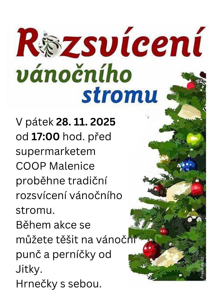 Rozsvícení vánočního stromu Místo konání: Malenice 28. 11., 1700 Zveme vás na tradiční rozsvěcení vánočního stromu.
