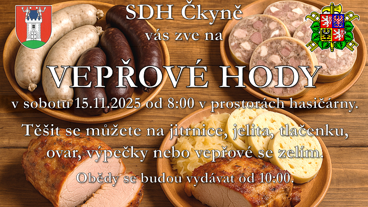 Gastro: Vepřové hody Místo konání: Čkyně 15. 11. 2025, 0800 SDH Čkyně vás zve na vepřové hody do hasičárny.