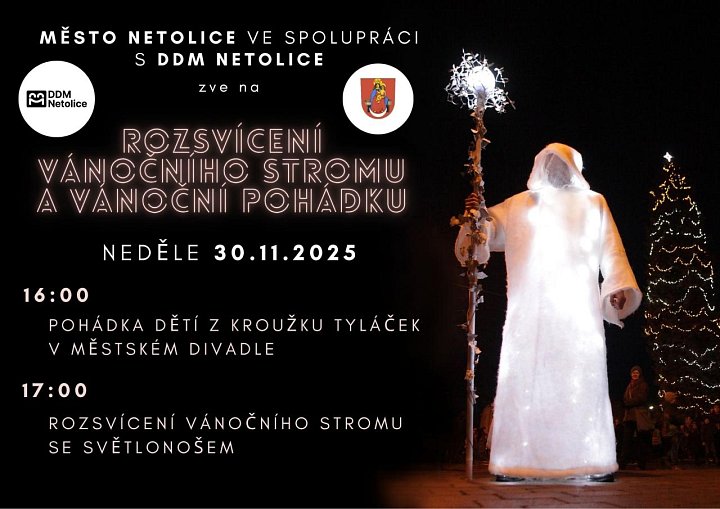 Rozsvícení vánočního stromu Místo konání: Netolice 30. 11., 1600 — 1700 První neděle adventní rozsvícení stromu se Světlonošem.