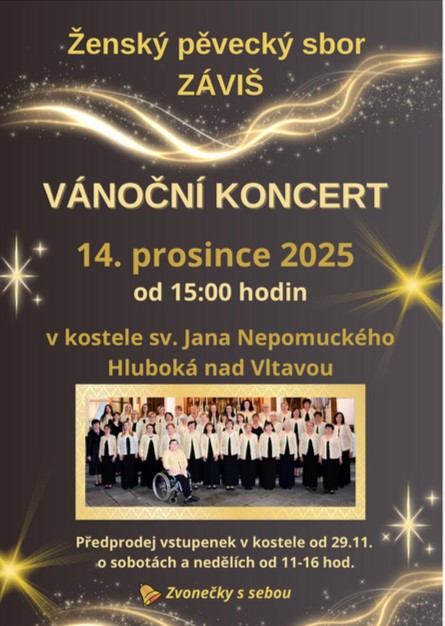 Ženský pěvecký sbor Záviš Vás srdečně zve na vánoční koncert v neděli 14. prosince 2025 od 15 hodin do kostela sv. Jana Nepomuckého na Hluboké.