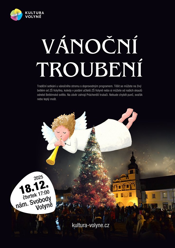 Těšit se můžete na živý betlém ZŠ Volyňky, koledy v podání učitelů ZŠ Volyně nebo si můžete od našich skautů odnést Betlémské světlo. Na závěr zahrají Práchenští trubači. Nebude chybět punč, svařák ani teplý mošt.