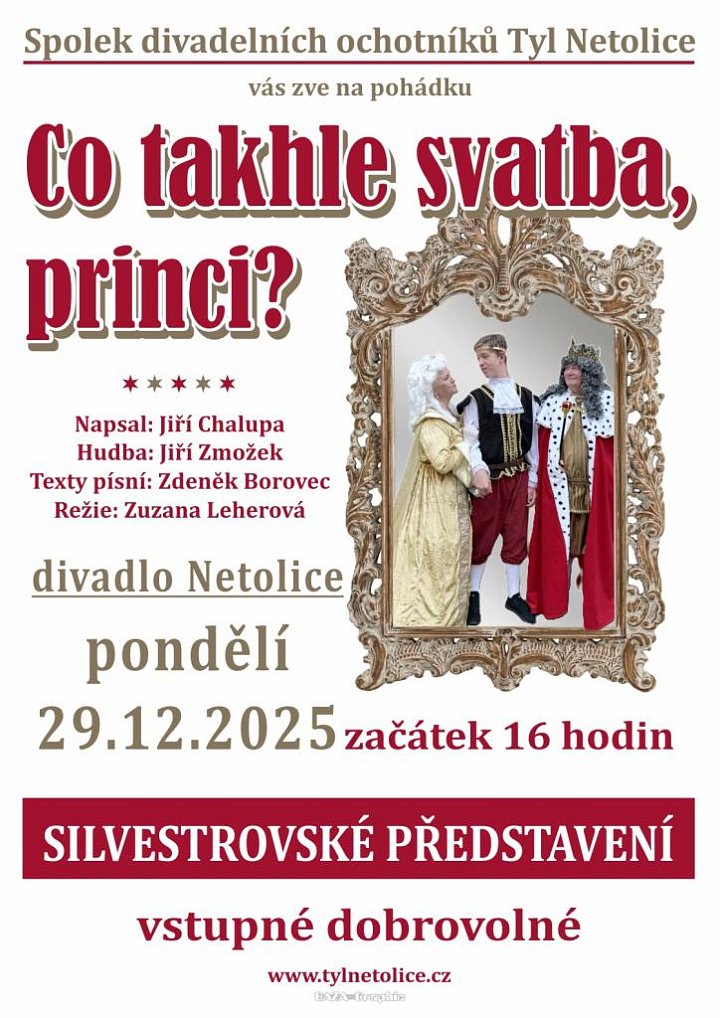 Divadlo: Co takhle svatba princi? Místo konání: Netolice 29. 12., 1600 Spolek divadelních ochotníků Tyl Netolice pořádá silvestrovské představení. Vstupné: dobrovolné