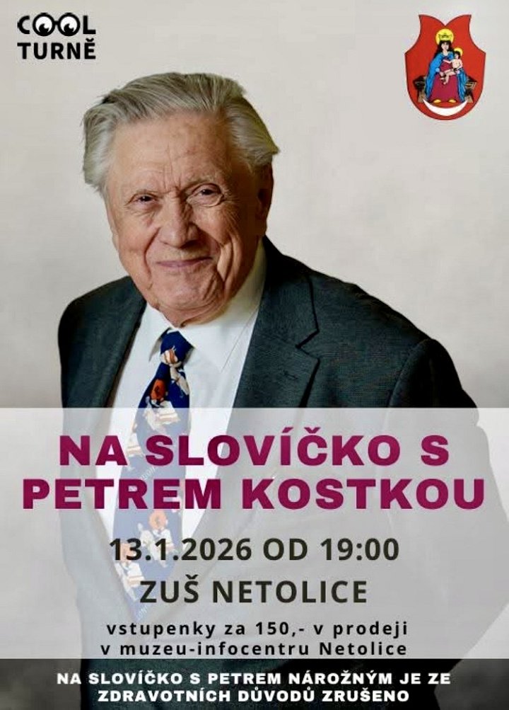 Ze zdravotních důvodů je Slovíčko s Petrem Nárožným zrušeno. Náhradou je pro Vás připraven v úterý 13.1. 2026 od 19 hodin v sále ZUŠ Netolice Večer s Petrem Kostkou.
