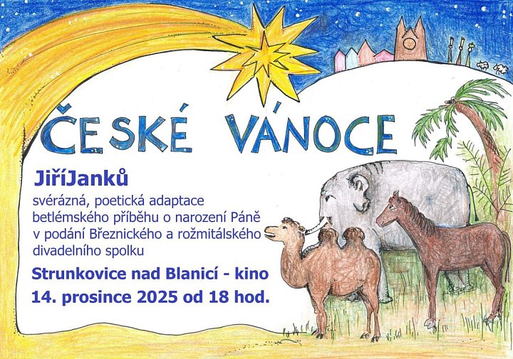 Divadlo: České Vánoce Místo konání: Strunkovice nad Blanicí 14. 12., 1800 Svérázná, poetická adaptace betlémského příběhu o narození Páně v podání Březnického a rožmitálského divadelního spolku. Vstupné: 100,- Kč