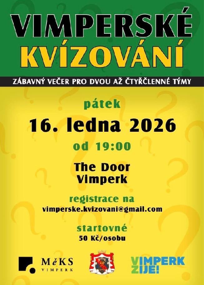 Přihlaste své týmy předem (NÁZEV TÝMU + POČET ČLENŮ) emailem na vimperske.kvizovani@gmail.com a vyčkejte na potvrzení Vaší rezervace.
