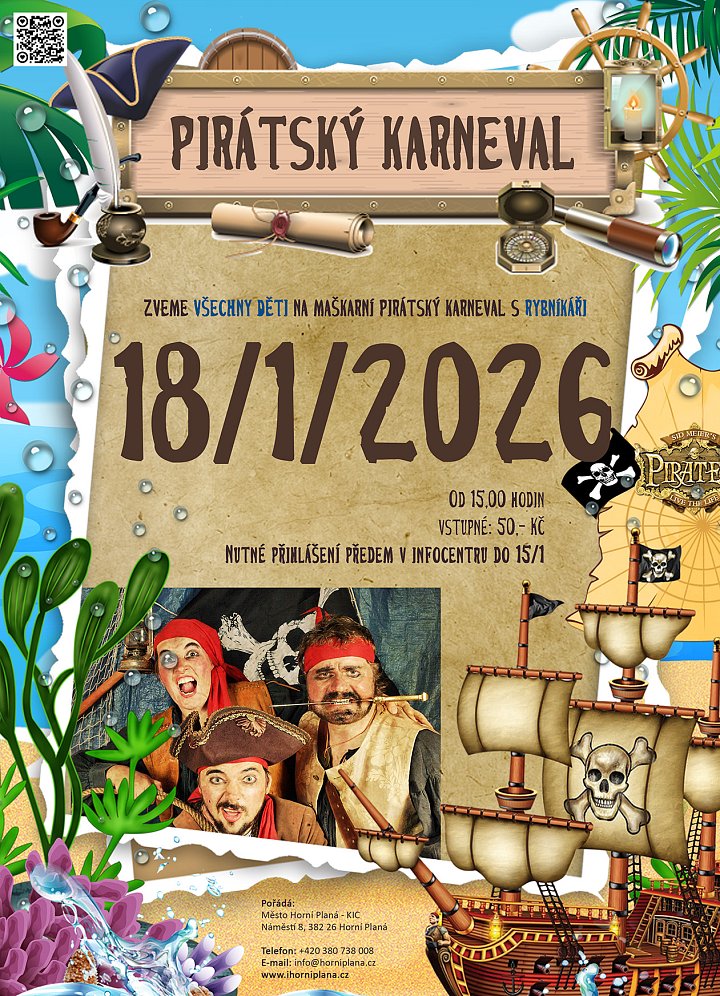 Zveme VŠECHNY DĚTI na tradiční Pirátský karneval s hudebně-divadelním spolkem Rybníkáři. Masky všeho druhy vítány! Pozor, na karneval je nutné přihlášení předem, a to v našem Infocentru Horní Planá nejpozději do 15. 1. 2026.
