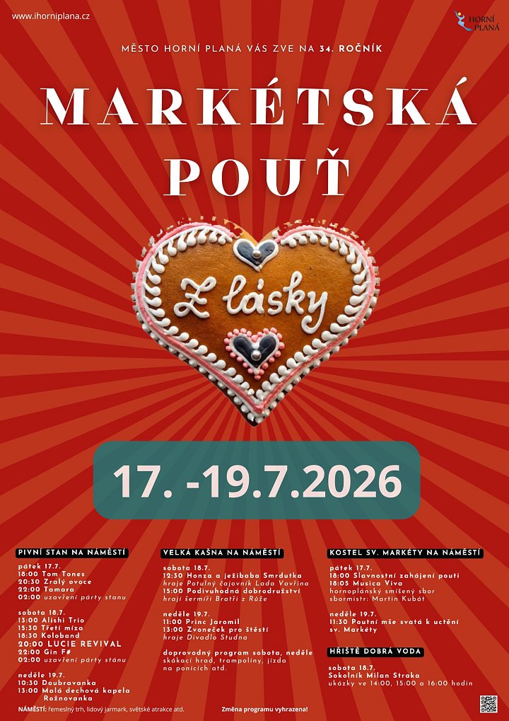 Zveme Vás na 34. ročník tradiční MARKÉTSKÉ POUTI v Horní Plané. Koncerty, divadla, lidová řemesla, světské atrakce, poutní mše svatá, ukázky sokolnictví a mnoho dalšího po celé tři dny od pátku až do neděle.