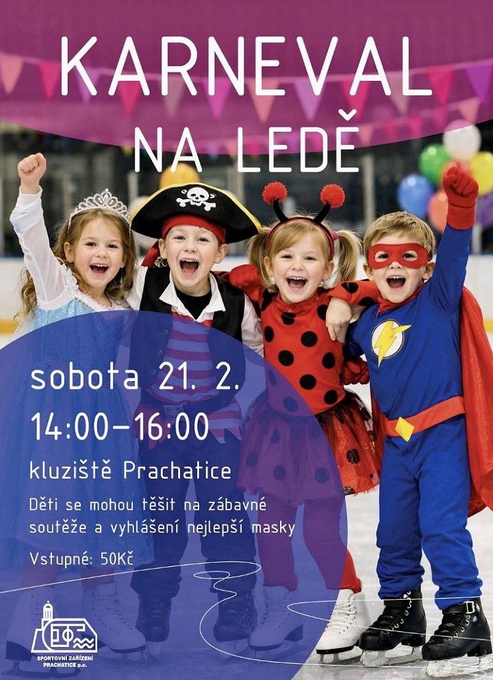 Karneval na ledě Místo konání: Prachatice 21. 2., 1400 — 1600 Děti si mohou těšit na zábavné soutěže a vyhlášení nejlepší masky. Vstupné: 50,- Kč