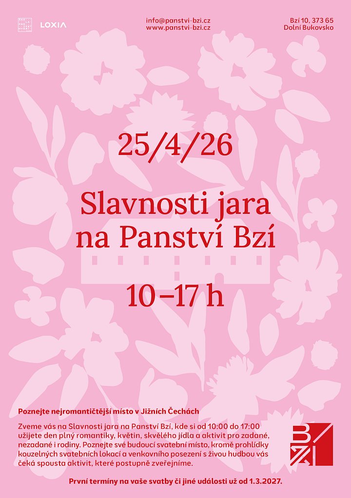 Zveme vás na Slavnosti jara na Panství Bzí, kde si od 10:00 do 17:00 užijete den plný romantiky, květin, skvělého jídla a aktivit pro zadané, nezadané i rodiny. Poznejte své budoucí svatební místo, kromě prohlídky kouzelných svatebních lokací a venkovního posezení s živou hudbou vás čeká spousta dalších aktivit, které budou brzy zveřejněny. Sledujte stránky panstvi-bzi.cz.