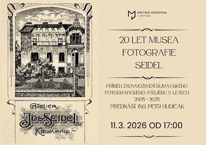 Přednáška: 20 let Musea Fotografie Seidel Místo konání: Vimperk 11. 3., 1700 Příběh znovuoživení šumavského fotografického ateliéru v letech 2005–2025, přednáší Petr Hudičák.