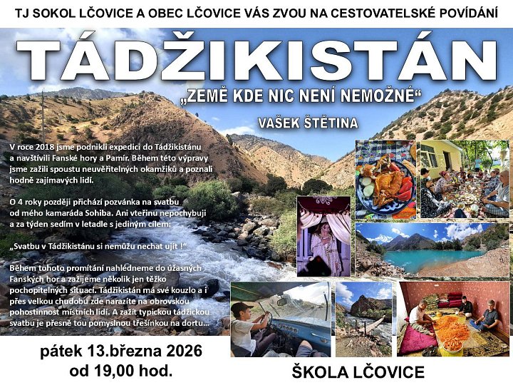 Na této přednášce se dozvíte spoustu zajímavých věcí o této zemi, užijete si nádhernou přírodu i pohostinnost místních lidí. Třešničkou na dortu bude pravá Tádžická svatba, která Vás určitě překvapí a nudit se rozhodně nebudete.