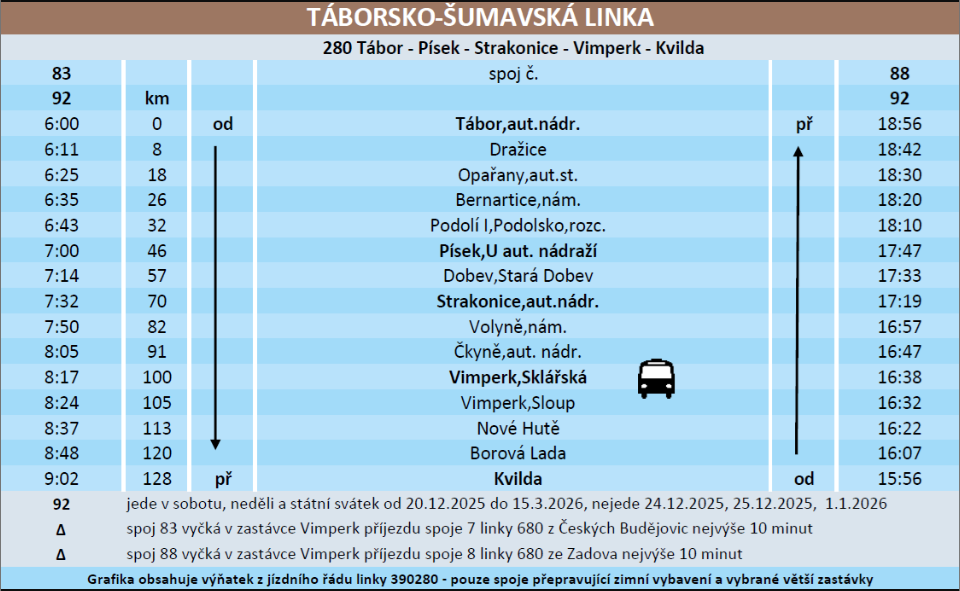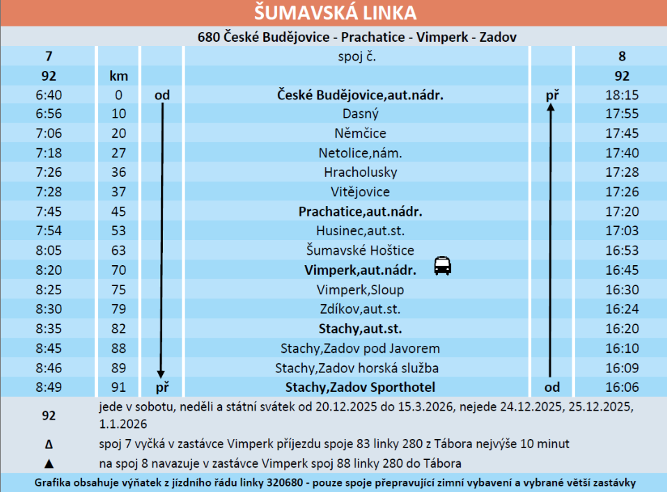 V letošní zimní sezóně na své trasy opět vyjíždí zimní spoje čtyř linek, které umožňují přepravu lyží, snowboardů, bruslí a dalšího zimního vybavení po celých jižních Čechách! V provozu jsou od 20. prosince 2025 do 15. března 2026 a spojí většinu velkých regionálních měst se zimními destinacemi Jihočeského kraje.