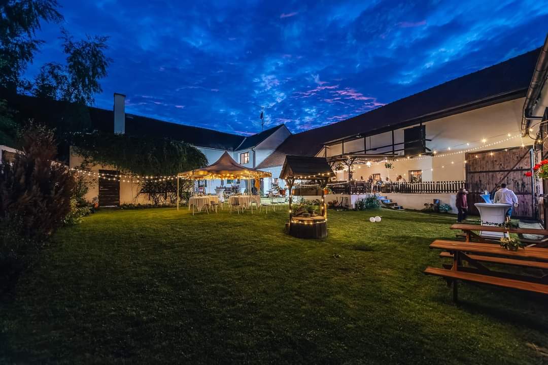 Oplocený statek s vlastním parkovištěm pro 10 aut. Jde o obdélníkový uzavřený objekt s krásným dvorem s posezením, udírnou a grilem a s velikou vedlejší zahradou s ohništěm a dětským koutkem. K dispozici je kuchyně, restaurace a salonek.